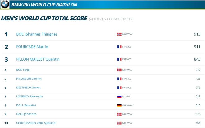 S’il ne portait pas le maillot jaune de leader au départ de la dernière course, il l’était déjà virtuellement. En effet, le règlement du classement général de la Coupe du Monde fait que les deux plus mauvais résultats de l’hiver sont retirés des comptes en fin de saison. Johannes Boe ayant manqué deux semaines, deux courses, il ne perdait alors aucun point sur ceux déjà acquis. Le Norvégien a donc pu tirer profit du règlement, mais cela n’enlève en rien son mérite.