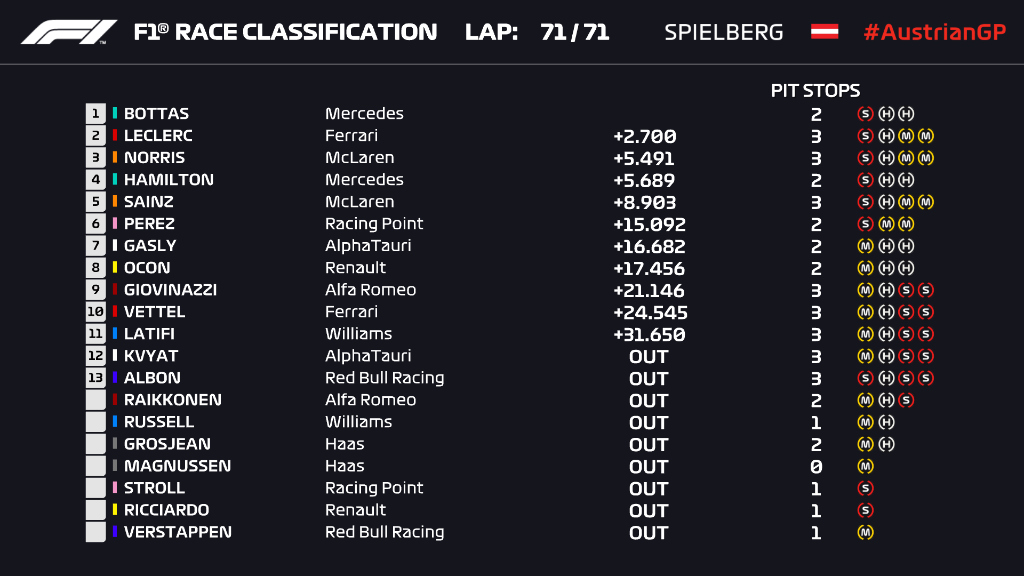 Sept mois, c’est le temps qui sépare cette reprise de la F1 du dernier GP couru. Les fans sont impatients et les pilotes prêts à en découdre sur le circuit de Spielberg. Pour cela, Valtteri Bottas s’élance en pôle devant Verstappen et Norris. De son côté, Hamilton part 5ème après une pénalité de 3 positions reçue avant le départ.