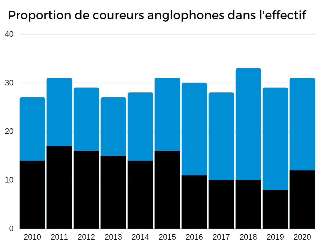 Seule l’arrivée de Tao Geoghegan Hart en 2017 semble rappeler les racines anglophones d’Ineos. Alors que le pourcentage de coureurs anglophones était d’au moins 50 % jusqu’en 2015, il tourne désormais depuis trois saisons autour des 30 %. Pour la première fois de l’histoire de l’équipe, seul un coureur britannique prendra le départ du Tour. Depuis 2010 et la première participation de l’équipe, il y avait au moins deux coureurs anglo-saxons au départ. Et les coureurs non-anglophones font partie des coureurs essentiels de l’équipe. On parle par exemple de Michal Kwiatkowski, vainqueur de Milan-San Remo, du Tour de Pologne, des Strade Bianche et de la Clasica San Sebastian sous les couleurs de la Sky ou d’Ineos. On peut également évoquer l’armada colombienne : Sergio Henao, vainqueur de Paris-Nice, évidemment Egan Bernal et Richard Carapaz mais aussi la pépite Ivan Sosa. L’équipe de Dave Brailsford mise sur de jeunes coureurs comme Bernal et Sivakov pour renouveler sa formation. La plupart des coureurs qui ont brillé ces dernières saisons ont pris leur retraite ou sont proches de la prendre.