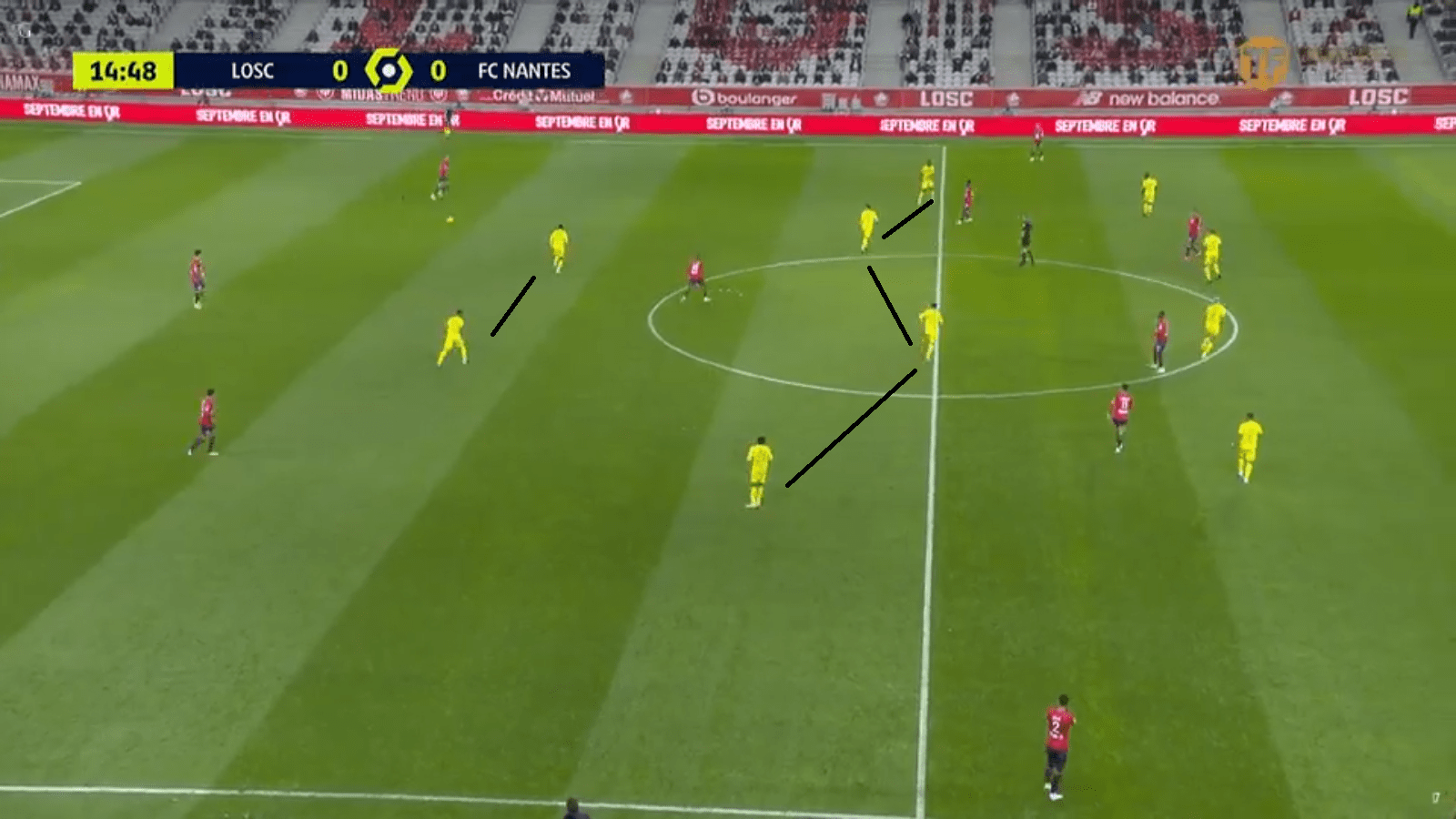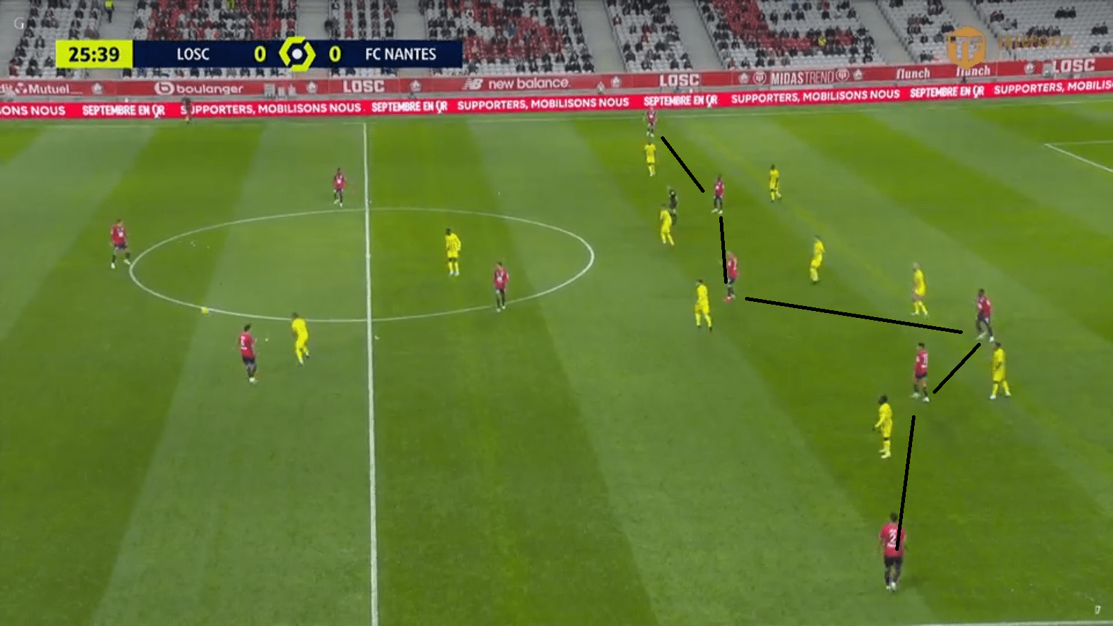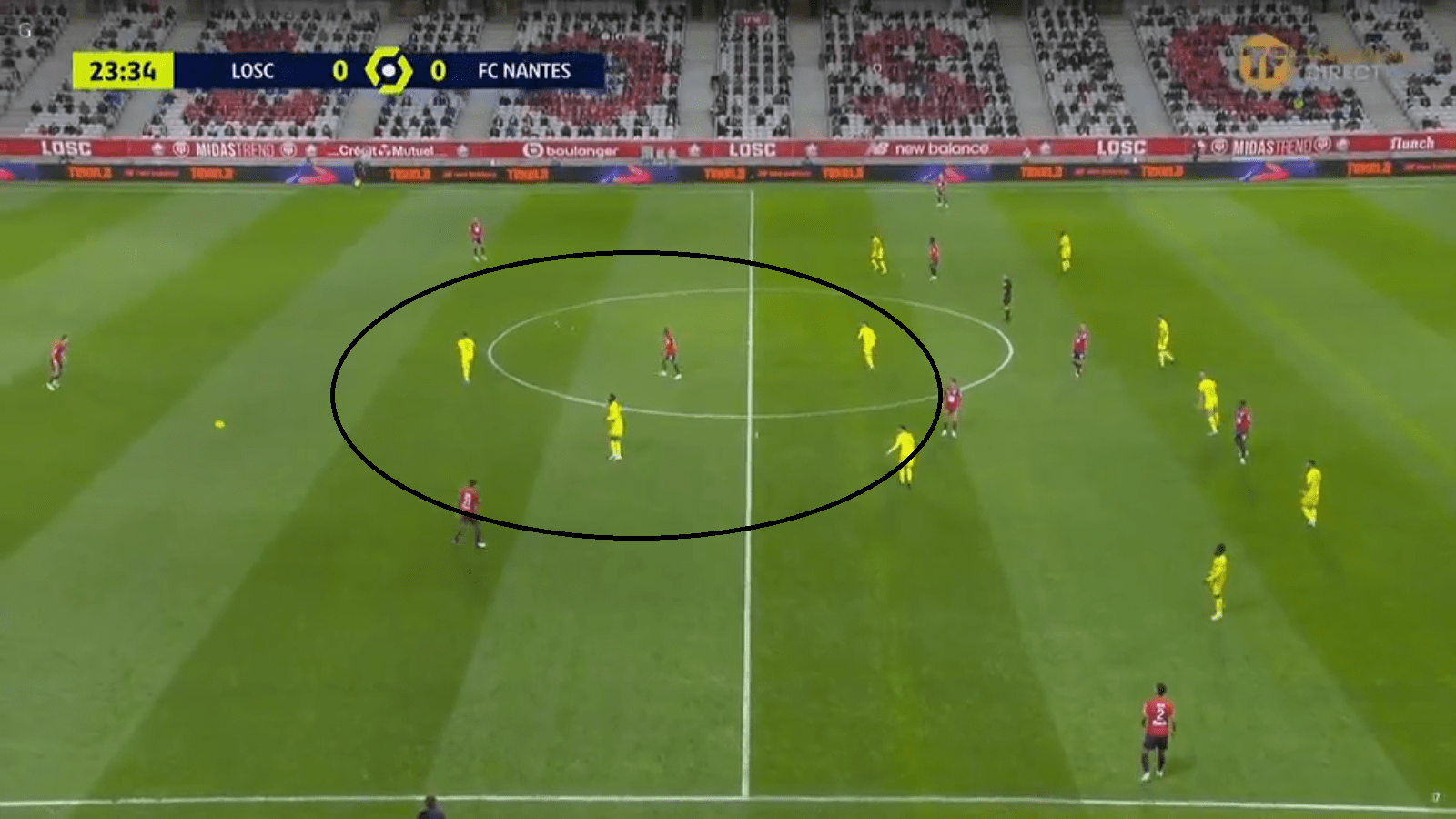 Au début du match, le milieu nantais a énormément gêné les relances lilloises. Benjamin André a eu beaucoup de mal à trouver ses coéquipiers derrière ce milieu, pourtant souvent étiré. La faute au manque criant de solutions intéressantes. Les ailiers nordistes ont lâché beaucoup d’énergie dans la récupération. Quasiment toutes les récupérations lilloises ont été le fruit d’une prise à deux entre un ailier et un joueur défensif comme André, Celik, Botman et Bradaric. De ce fait, les percussions vers l’axe, qui ont fait la réussite de Bamba et Araujo en ce début de saison se sont faites moins insistantes. Les offensifs lillois se sont souvent retrouvés près de la défense nantaise, attendant les ballons longs de la garde défensive.