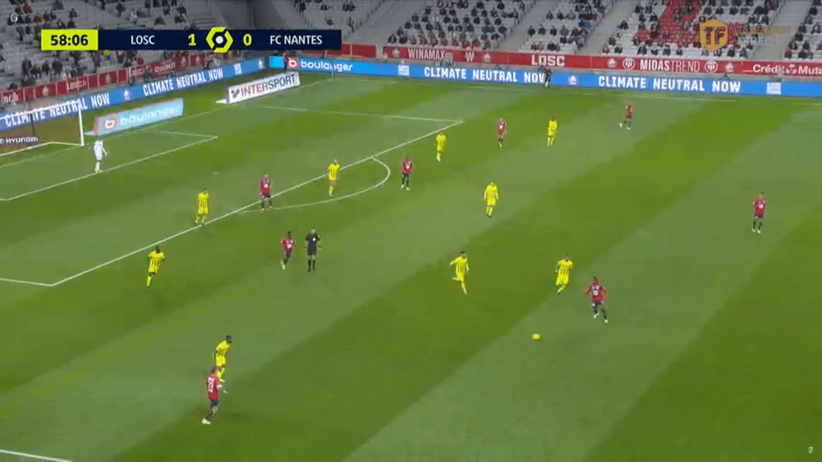 Un objectif compliqué à atteindre face à des lillois qui n’ont pris que deux buts depuis le début de saison. Les ailiers nantais ont gagné trop peu de duels. José Fonte (89 % de duels remportés cette saison, aucun défenseur ayant disputé au moins dix duels ne fait mieux) a vite étouffé les accélérations de Kolo Muani. Les Verts et Jaunes n’ont touché que deux ballons dans les 18 mètres lillois durant les 25 premières minutes. Le parquet lillois a même été saisi pour des soupçons d’emploi fictif concernant Mike Maignan en 1ère mi-temps, c’est dire !