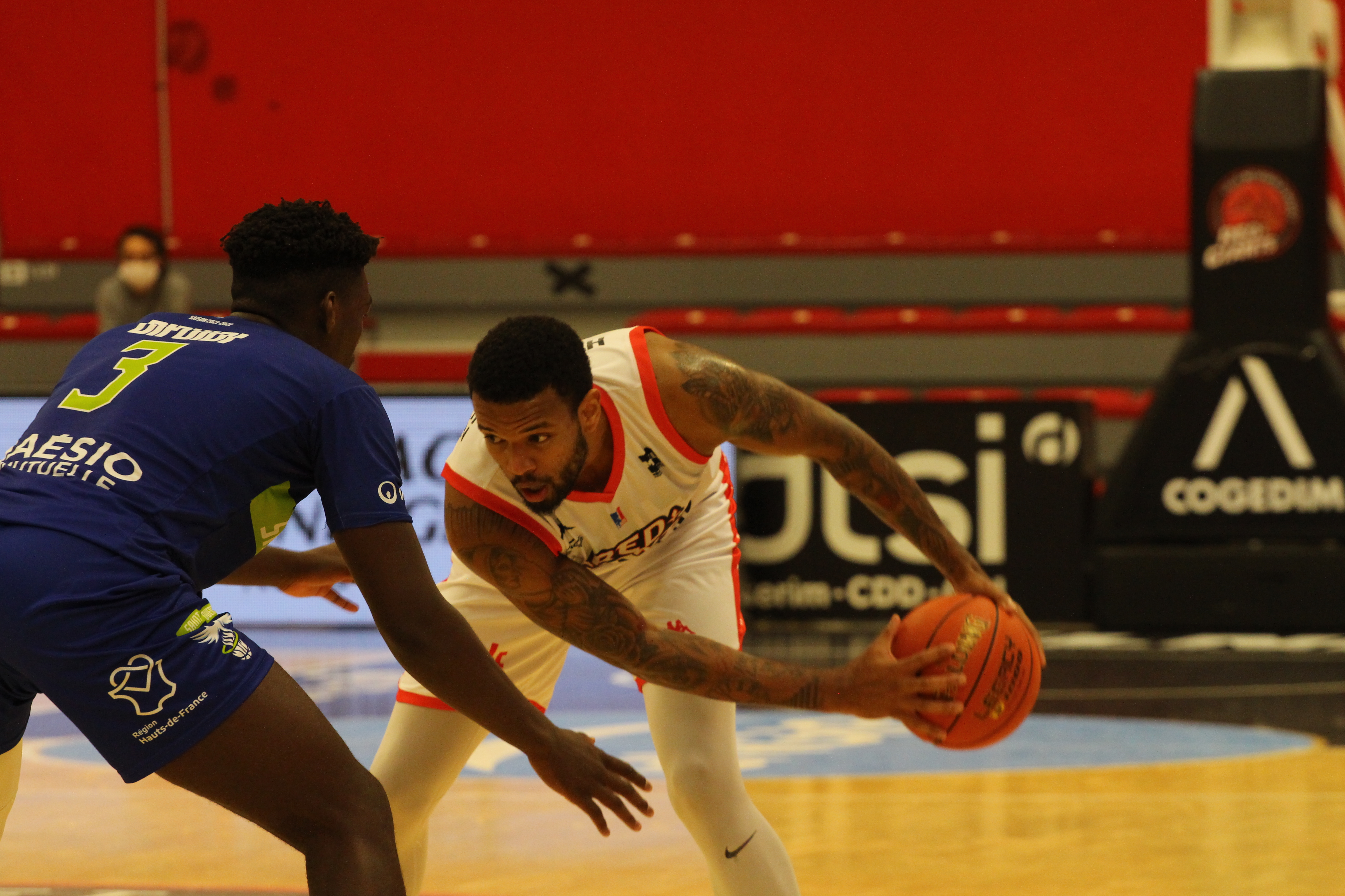 Un derby est souvent accroché et celui d’hier n’a pas fait exception en 1ère mi-temps. 2 équipes au coude-à-coude, d’abord défensivement. Pressing tout terrain + pression sur le porteur de balle côté lillois, aucun panier facile et une vigilance accrue pour ne pas laisser de shoot ouvert à 3 points côté Saint-Quentin. Insuffisant toutefois pour décourager Adonys Henriquez, l’une des nouvelles recrues lilloises qui en marquera 2 très loin de la ligne.