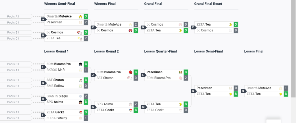 Le moins que l’on puisse dire, c’est que les résultats des poules étaient inattendus. Notamment pour Tea, joueur japonais de Pac-Man et Kazuya, alors annoncé comme un des favoris de ce tournoi. Il est battu sèchement 2-0 par le Français Oryon. Mais il parvient à revenir en se défaisant de Bloom4eva et de Fatality respectivement 2-0 et 2-1, lui permettant de passer les poules en winner. Mais dès son premier match, Tea tombe contre Cosmos 3-2 dans un match d’une intensité folle. Il rentre alors dans l’arbre looser. Il élimine respectivement ses deux compatriotes Gackt et Paseriman 3-0. En looser final (équivalent d’une petite finale permettant d’accéder à la grande finale), Tea bat l’Américain Muteace 3-1. Lorsqu’il retrouve Cosmos en grande finale, il lui inflige un violent 6-0, le sacrant vainqueur. Le Japonais signe ici une performance à l’image de son niveau, exceptionnelle.
