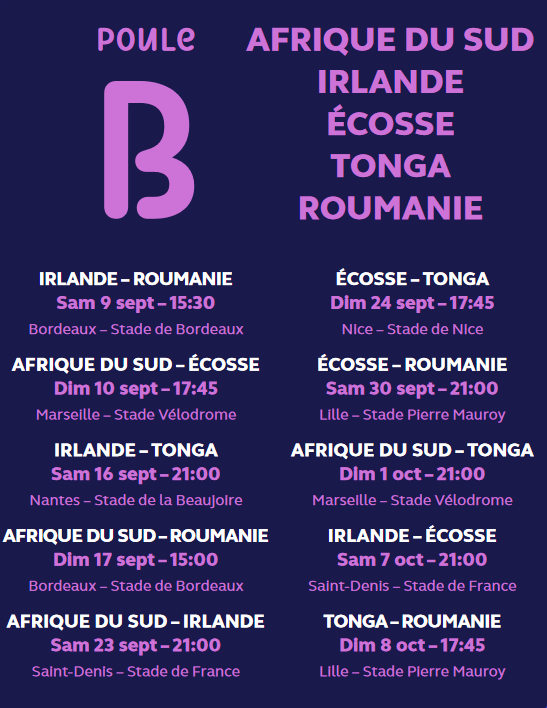 Champion du monde en titre, l’Afrique du Sud aura à cœur de garder sa couronne. Auteurs d’un tournoi de préparation étincelant, avec une démonstration contre la Nouvelle-Zélande (35-7), les Boks arrivent eux aussi en grande forme. Les hommes de Jacques Nienaber pourront compter sur leur capitaine Siya Kolisi, puissant, sur et en dehors du terrain. Premier capitaine noir des Springboks, il est l’incarnation d’une nation composée de 80 % de joueurs noirs et de métis profondément marquée par l’Apartheid. Dans la poule de l’Irlande, l’Afrique du Sud devra utiliser son expérience de triple championne du monde (en 1995, 2007 et 2019) pour se hisser en ¼ de finale. Si l’équipe n’est pas la plus impressionnante sur le papier, à chaque grand rendez-vous, ils apparaissent en mission pour leur pays qui fait face a de nombreux défis économiques et sociaux.