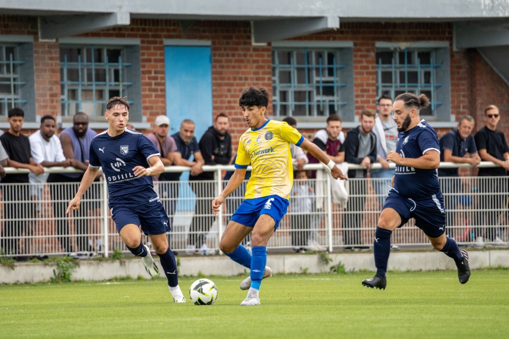 La troupe de l’OMF est la première à mettre le pied sur le ballon. Ryan Adim, dans tous les bons coups, lance d’une pichenette Nordine El Aarrassi dans la profondeur, qui bute sur Laurent Lecomte (15′). L’attaquant marcquois, titulaire au coup d’envoi à la place de Kyllian Mammou, n’attrape ensuite pas le cadre sur un centre ajusté du jeune Yanis Afkir (28′).