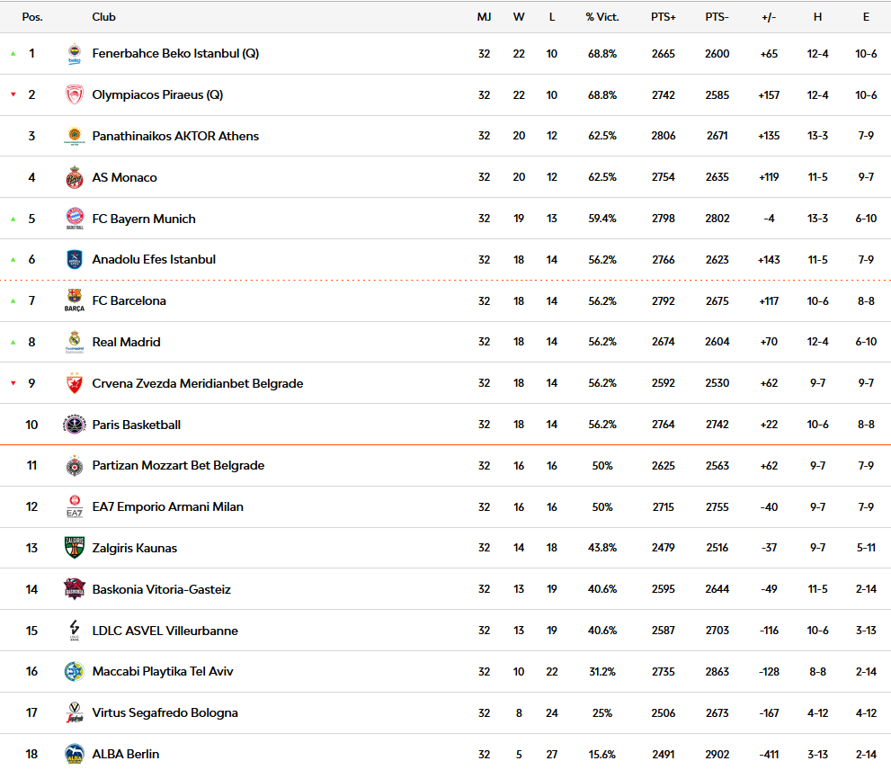 18 victoires et 14 défaites pour Paris qui prend de l’avance sur le Partizan Belgrade, premier non qualifié (16-16). Au programme, un énorme match face au Real Madrid avant de terminer cette phase de saison régulière à la maison avec la réception de l’ALBA Berlin. Peu importe le résultat du club cette saison en Euroleague, les Parisiens auront déjà fait vibré leurs fans, qu’ils retrouveront l’an prochain dans cette même ligue…