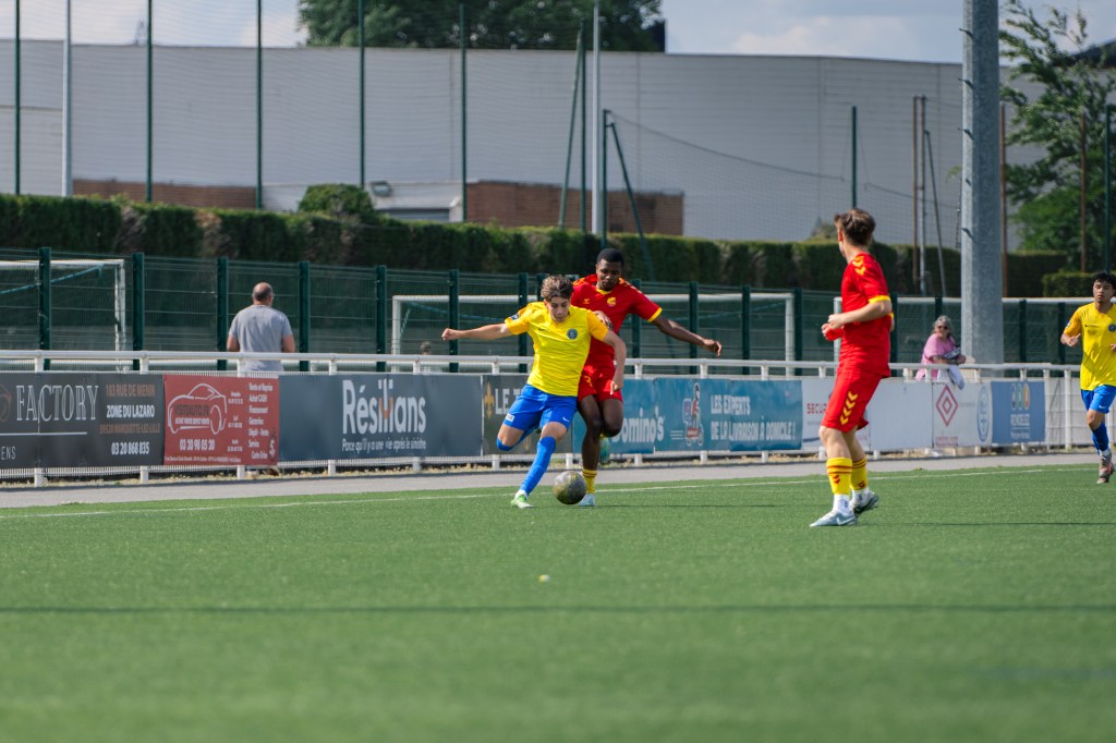 Au retour des vestiaires, l’intensité diminue. La chaleur du terrain synthétique affecte les organismes. Le gardien de l’OMF, Constant Bodrero, sort quelques parades (53e), mais il ne peut pas empêcher la reprise de volée de Timéo Lelong (60e), qui accroit l’avance des Normands.