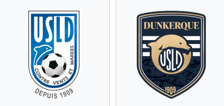 Le changement majeur est l’affichage du nom de la ville, une première depuis la fondation du club en 1909 (écrit au bas du logo). Au centre, le monogramme USLD, en forme de ballon, est entouré d’un dauphin bien plus mis en avant que précédemment. Celui-ci fait référence au fils aîné de Louis XIV, Louis de France (1661-1711), à qui le roi avait fait cadeau de Dunkerque. Ce delphinidé est d’ailleurs aussi présent sur les armoiries de la cité. Derrière, les rayures blanches sur fond bleu s’inspirent du drapeau de la ville. On remarque aussi des ornements foncés représentant la mer. Situés au bas du bouclier, ils font écho aux motifs de la Duchesse Anne, le plus grand voilier français, attaché au port dunkerquois.