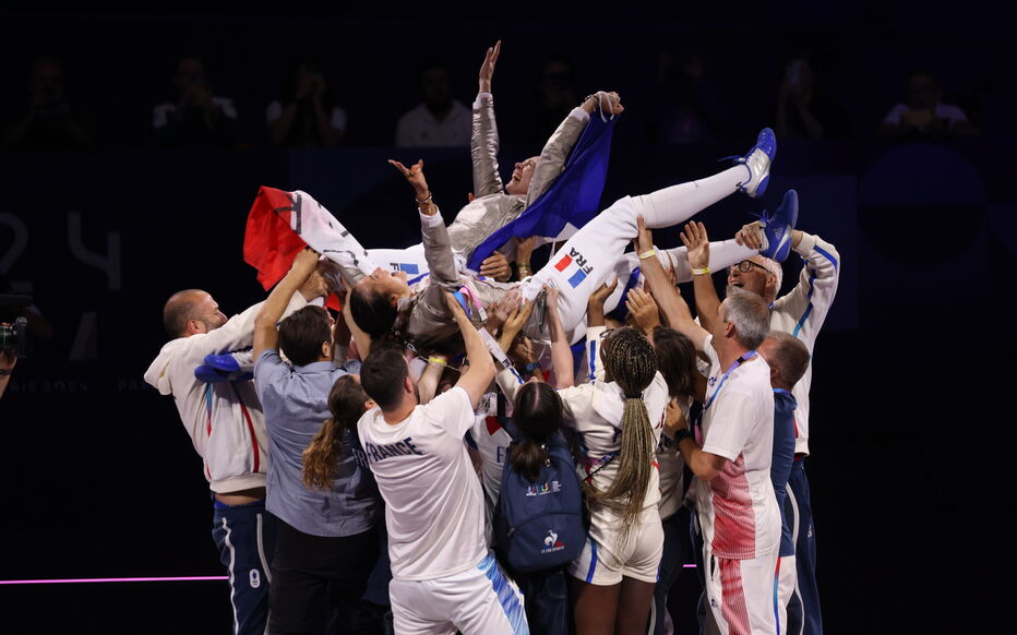 Célébration de l’équipe de France de sabre après la finale des Jeux Olympiques 2024