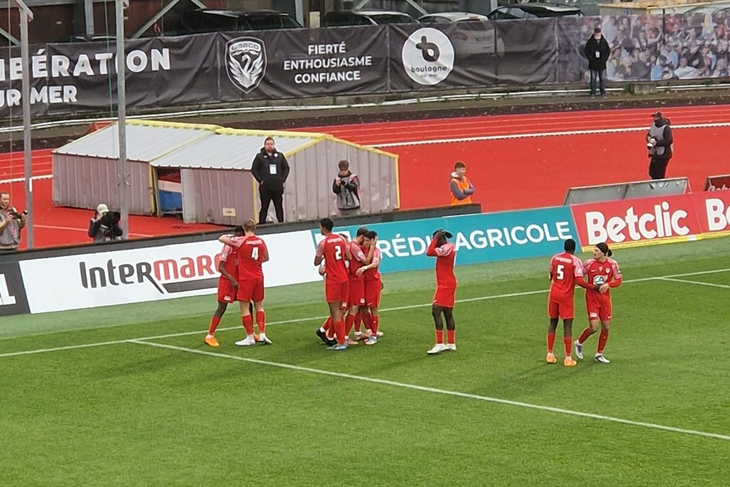 Sûrs de leur force, les Boulonnais entament avec détermination et audace la rencontre. Ils prennent la maîtrise du ballon, perçant à plusieurs reprises la défense dunkerquoise, à l’image de la première alerte sur le but de Marcos Lavin, qui était resté bien vigilant pour se jeter dans les pieds de Corentin Fatou (7e). Le ton est donné, Boulogne continue de se montrer dangereux, Dunkerque est acculé sur sa propre cage. Il ne faut pas attendre très longtemps pour voir les locaux concrétiser leur domination. Dès la 9e minute, Corentin Fatou, encore lui, place une reprise de volée croisée à la réception d’un centre de Sonny Duflos. Le portier maritime ne peut rien faire, les gradins explosent, et Boulogne prend les devants (1-0).