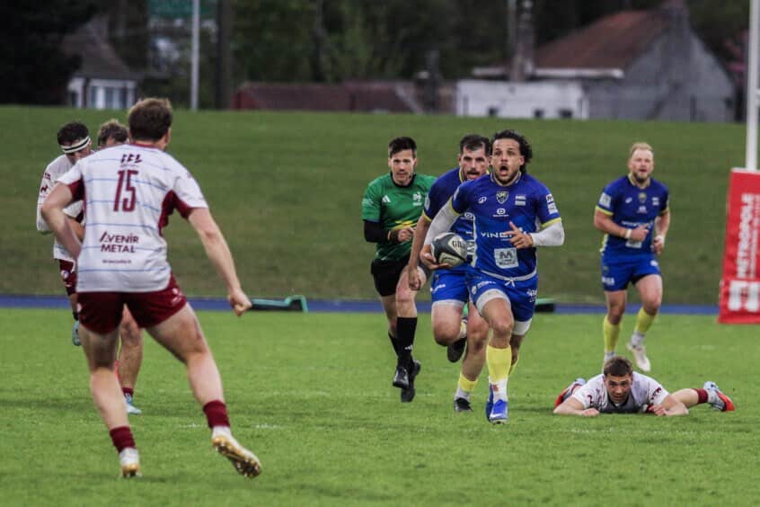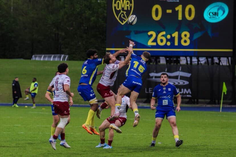 En début de deuxième partie, les Jaune et Bleu persistent avec quelques percées, mais aucune action n’est aboutie. S’ensuit un carton jaune pour l’OMR accordant une pénalité aux extérieurs puis deux essais menant le score à 0-27.