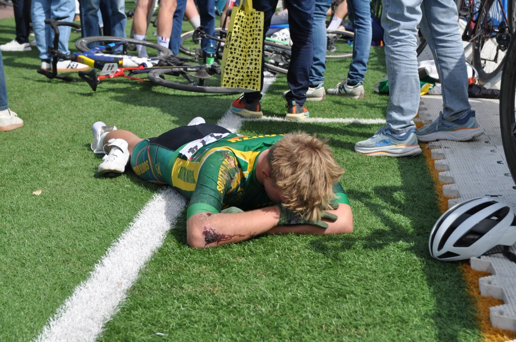 Esseulé, Dean Woolley n’a pas résisté longtemps aux retours des différents attaquants revenus de l’arrière, à l’image de Thijs Wiersma, sorti du peloton à 25 kilomètres du but, revenu sur la tête de la course grâce à son compatriote Gijs Winters qui s’est remis immédiatement sur le vélo après sa chute. Le duo néerlandais s’est ensuite débarrassé du Sud-Africain et semblait se jouer la victoire. C’était sans compter le retour canon de Karl Herzog, qui les a rattrapés dans les derniers mètres avant le Vélodrome. « J’ai essayé d’être très défensif dans la première partie de course, et à un rond-point, je suis allé à gauche et eux à droite, donc c’est comme ça que je suis parti et que j’ai rattrapé les Néerlandais », raconte le champion d’Europe. Malheureusement, cela n’a pas suffi pour l’Allemand, qui, après un gros travail de Gijs Winters pour conserver les quelques secondes d’avance que le trio possédait sur le peloton, s’est fait battre au sprint par Thijs Wiersma. « Quand on est deuxième, on est toujours déçu, mais je suis très fier d’être deuxième. »